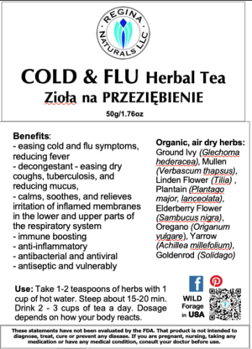 Ground Ivy (Glechoma hederacea), Mullen (Verbascum thapsus), Linden Flower (Tilia) , Plantain (Plantago major, lanceolata), Elderberry Flower (Sambucus nigra), Oregano (Origanum vulgare), Yarrow (Achillea millefolium), Goldenrod (Solidago)