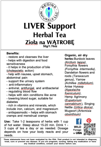 Organic, air dry herbs: Burdock leaves (Arctium lappa), Forsythia flowers (Forsythia intermedia), Dandelion flowers and roots (Taraxacum genus), Yarrow (Achillea millefolium), Anise Hyssop (Agastache foeniculum), Hemp Agrimony (Eupatorium cannabinum), Singing Nettle (Urtica dioica), Mugwort (Artemisia obsinthium