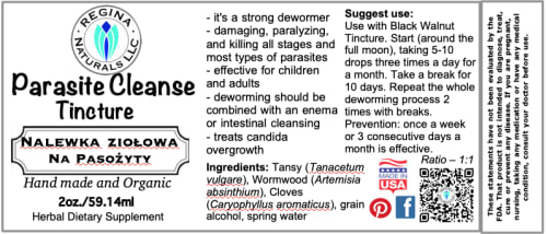 Suggest use:  Use with Black Walnut Tincture. Start (around the full moon), taking 5-10 drops three times a day for a month. Take a break for 10 days. Repeat the whole deworming process 2 times with breaks.